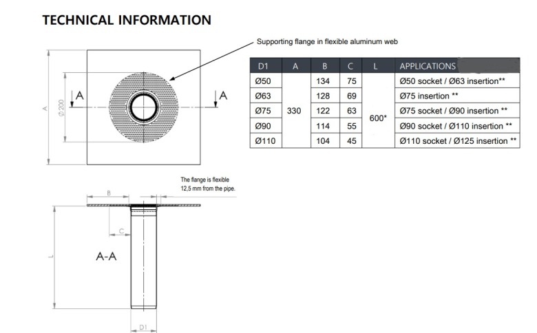 Takbrunn Flex Bitumen är designad för situationer där ett vertikalt utlopp inte är möjligt på grund av takets specifika form. Den flexibla flänsen gör det möjligt för den integrerade bitumenmembranen att anpassa sig till takets lutning och form. Takbrunnen finns i fem olika storlekar: Ø50, Ø63, Ø75, Ø90 och Ø110, med en rörlängd på 600 mm, och levereras med en O-ring. Välj önskad rördiameter och rörlängd genom att klicka på "info"-knappen.