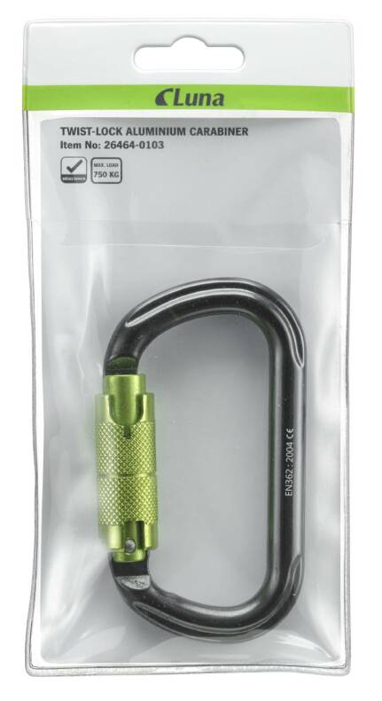 Luna Karbinhaken med Snabblåsning är tillverkad av aluminium och utrustad med en pålitlig skruvlåsning. Den har en imponerande brottgräns på 2300 kg och klarar en maximal lastkapacitet på 750 kg, vilket gör den idealisk för säkra anslutningar.