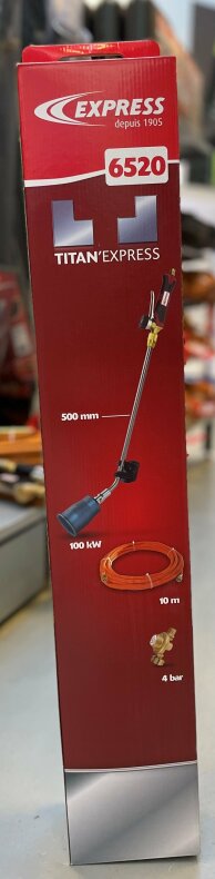 Express komplett takläggningsbrännare av titan för takarbete levereras med följande utrustning: Ett avtryckarhandtag med vänster 3/8 tums anslutning. En 10 meter lång flexibel gummislang, utrustad med hona vänstergängade kopplingar. En fast regulator med 4 bars tryck, med vänster 3/8 tums utlopp. En titanbrännare med diameter 60 mm och ett 500 mm långt halsrör. Denna extremt kraftfulla brännare är både robust och lätt, vilket gör den till ett idealiskt val för professionellt takarbete där hög prestanda och hållbarhet krävs.