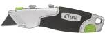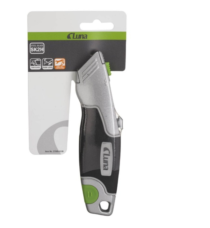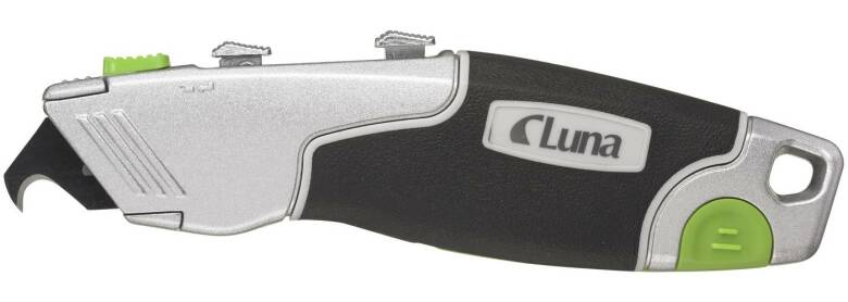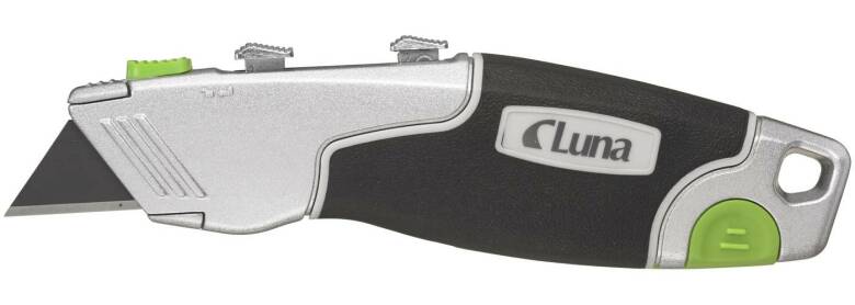 Universalkniven med dubbla blad från Luna är tillverkad av zinklegering och har ergonomiska gummidetaljer för bekväm användning. Den är utrustad med två reglage för både krokblad och rakt blad, samt ett bladmagasin integrerat i handtaget. Kniven levereras med SK2H-blad och har även ett hål för verktygssäkring.