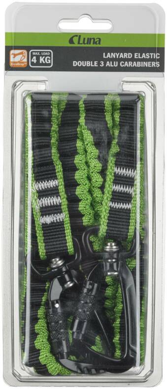 Denna elastiska stropp är en flexibel lösning med dubbel polyesterrem och en energidämpande funktion. Den är utrustad med låsbara svängbara karbinhakar av aluminium i båda ändar, med en kroköppning på 12 mm.