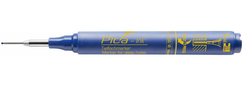 Pica Ink märkpenna i blå färg är en tuschpenna idealisk för precisionsmärkning i smala och djupa hål. Den har en teleskopisk spets av rostfritt stål med en diameter på 1,5 mm, vilket gör det enkelt att markera genom konsoler och skruvhål. Pennkroppen är helt tillverkad av plast, vilket gör att den inte leder ström och ger permanent märkning på alla torra ytor och material.